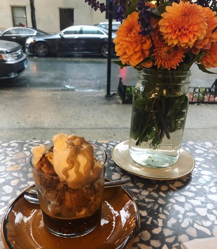 I’ve never had this Italian sundae before, and now I’m convinced this is the perfect after-work treat. The flavors are fantastic, but the experience is insatiable. I start at the top with the panna and the drizzle (which I would happily eat all by itself). The cream is beautifully light but isn’t really sweet at all, while the drizzle is thick, creamy and tangy with that back-of-the-throat warmth from the cinnamon. It’s everything I knew I needed. Then I work my spoon down to the ice cream, which is sweet without being sugary and tastes primarily like hazelnut and a sticky bun that isn’t super cinnamon-y. It has pockets of brown sugar “goo” like you’d get in a cinnamon bun, and those little bites are the best. The ice cream itself is smooth and creamy, but not to be mistaken for gelato. It’s definitively ice cream. The weirdest part of experiencing an affogato for the first time is realizing that it is the antithesis of a hot fudge sundae. Where the chocolate sauce would add sweetness, the black coffee adds bitterness. It’s incredibly complimentary because it keeps the whole affair from ever becoming too sweet, satisfying a more adult sweet tooth. I don’t even like black coffee but with ice cream, I think it really works.